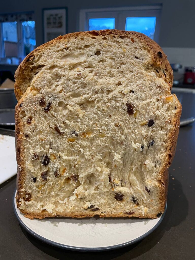 完成後的Panettonne鬆軟可口,洋溢着冧酒的香味。This Panettone is soft and fluffy, with a hearty aroma of rum.